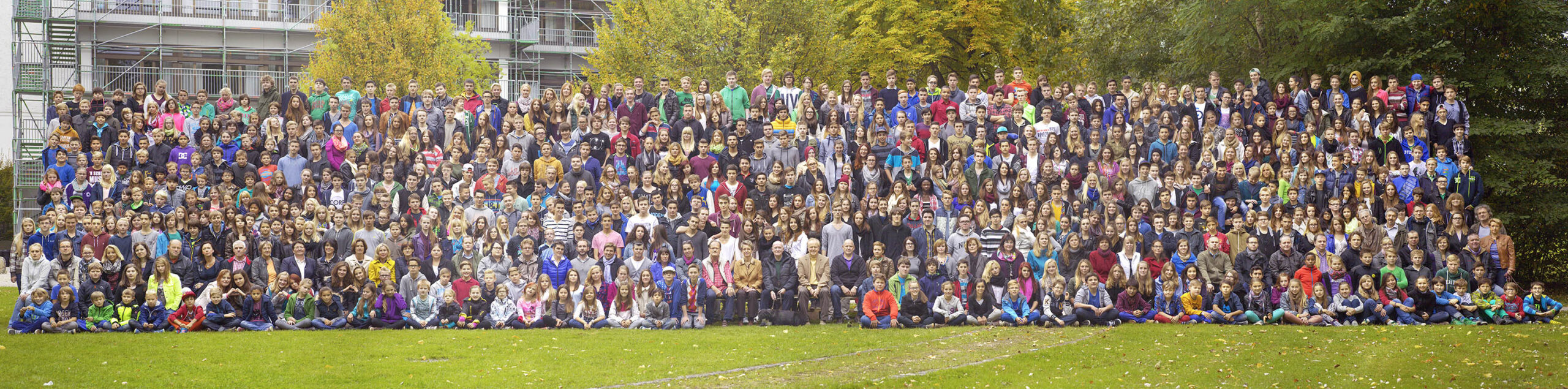 Gruppenaufnahme der Wirtschaftsschule Ingolstadt (Deutschland) mit über 800 Schüler